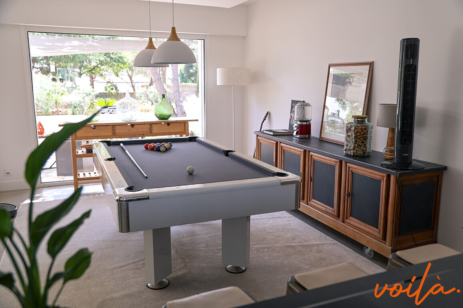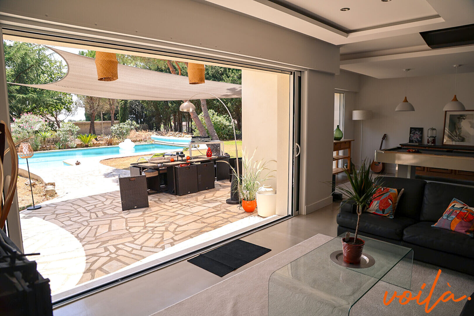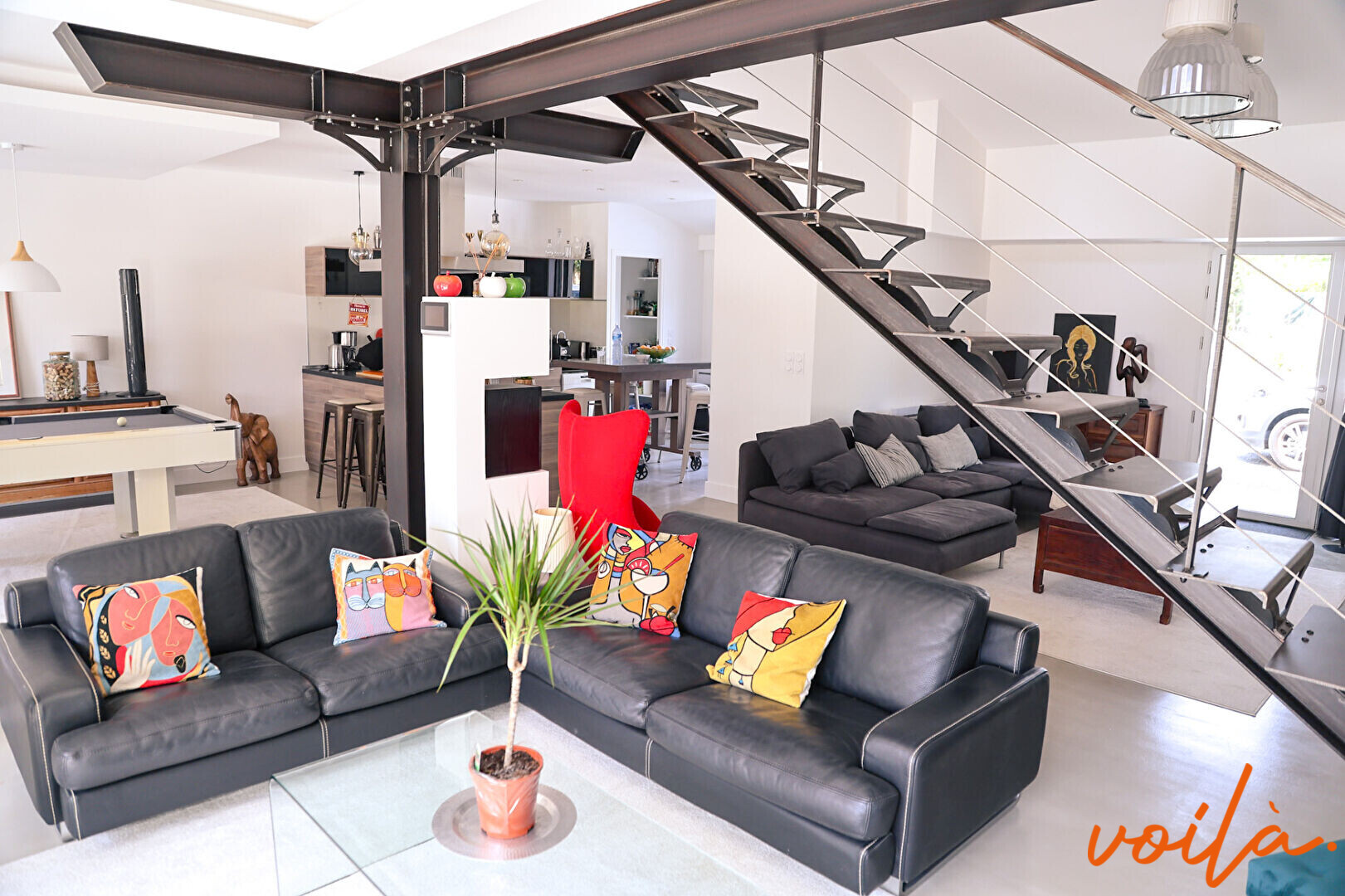 Villa d'architecte de 181 m2 hab. comprenant un séjour / cuisine de 80 m² baigné de lumière naturelle, le coin salon avec cheminée, et une arrière cuisine équipée. Un escalier métallique apporte une touche architecturale forte et donne accès a une mezzanine (poss 4ème chambre). La maison comprend 3 chambres avec accès direct au jardin dont 1 avec dressing, 1 salle de bains indépendante, 1 salle d'eau ainsi que 2 WC.