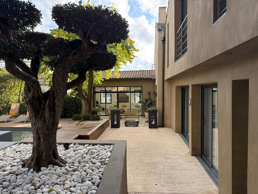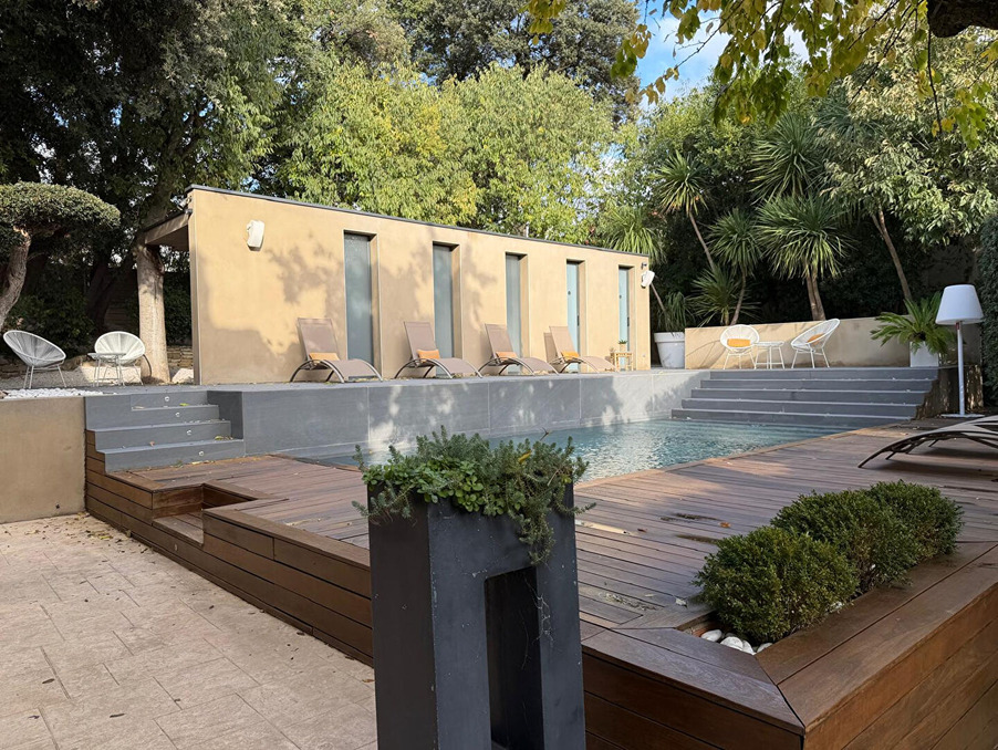 A l'extérieur sur un terrain arboré et paysagé de 842 m², on retrouve une piscine , d'espaces de détente, de plusieurs terrasses et d'un pool house avec douche et WC, le tout offrant une vue exceptionnelle sur la Cité.
